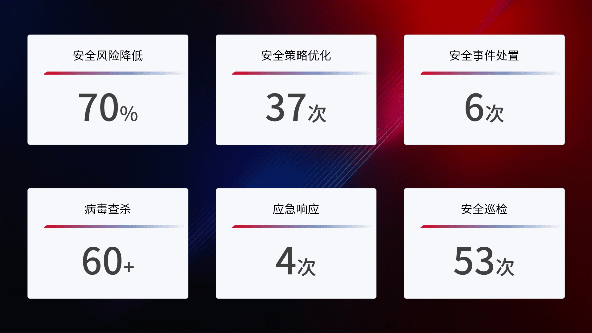 提供全面的安全事件报告体系,,包括处置报告、、、周报、、、、季度和年度总结,,,,结合持续监控,,,帮助客户深入了解网络安全状况。。。。